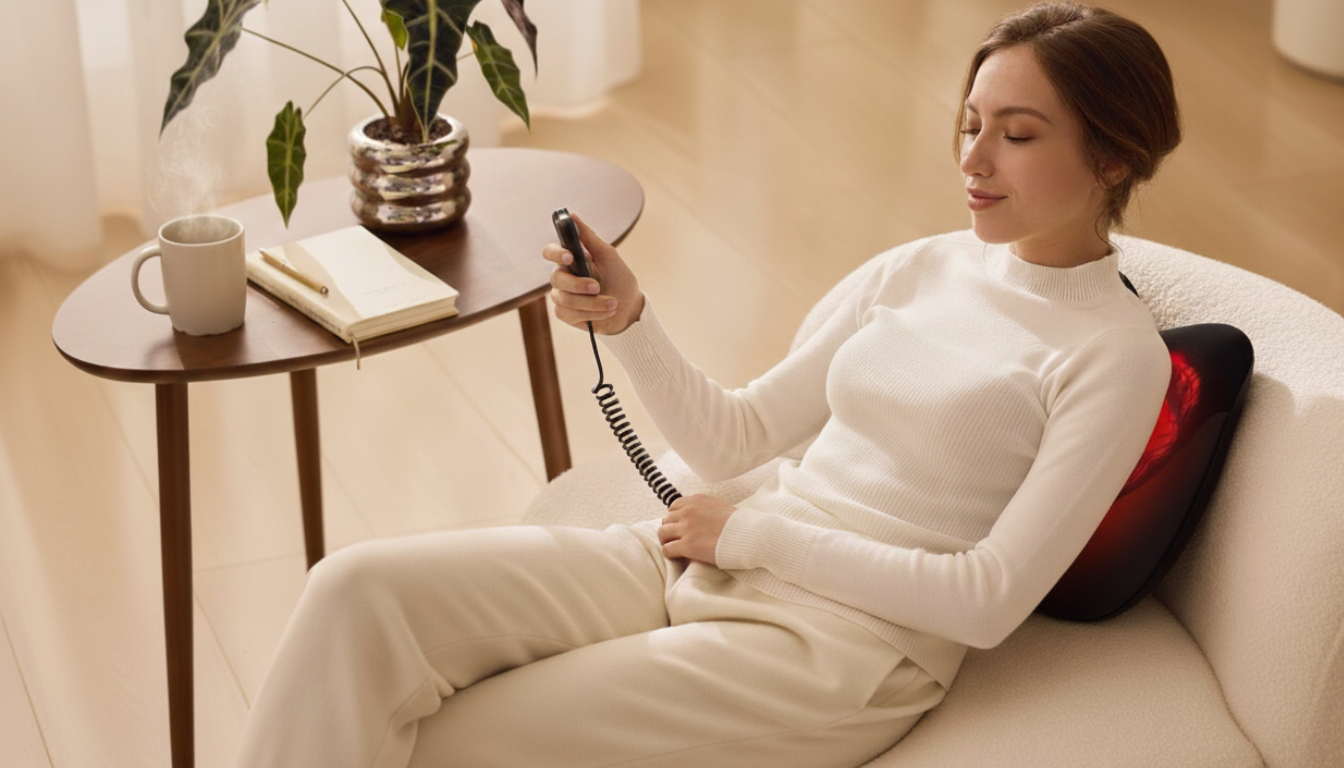 כרית עיסוי עם טכנולוגיית FIR לחימום מהיר, עיסוי נקודתי עמוק, שלט אלחוטי וסוללה נטענת.