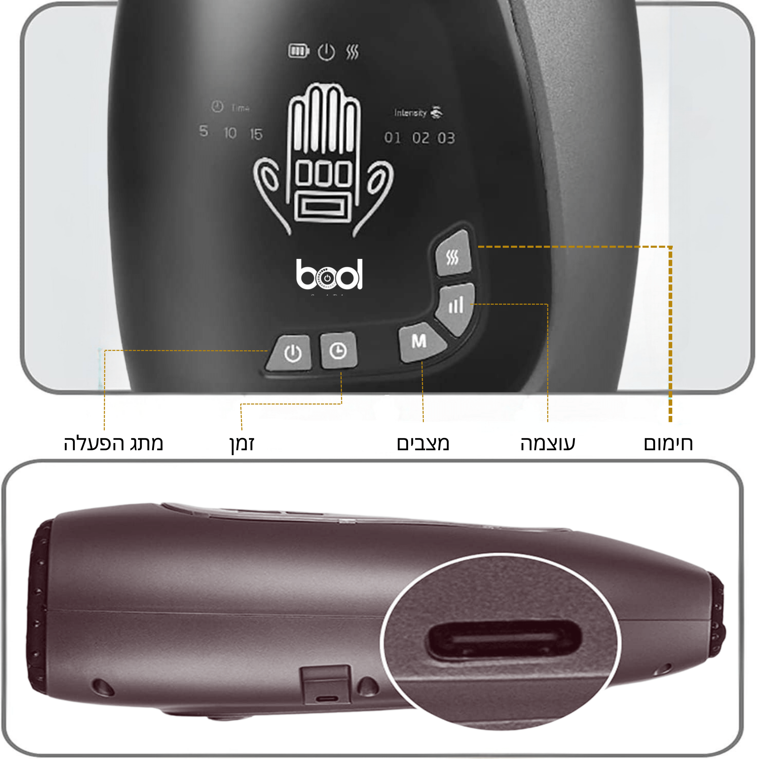 עיסוי לכף היד ומפרקי האצבעות עם חימום, כריות אוויר וגלילים חכמים. כולל מצבי עיסוי שונים בעיצוב חדשני ומרגיע.