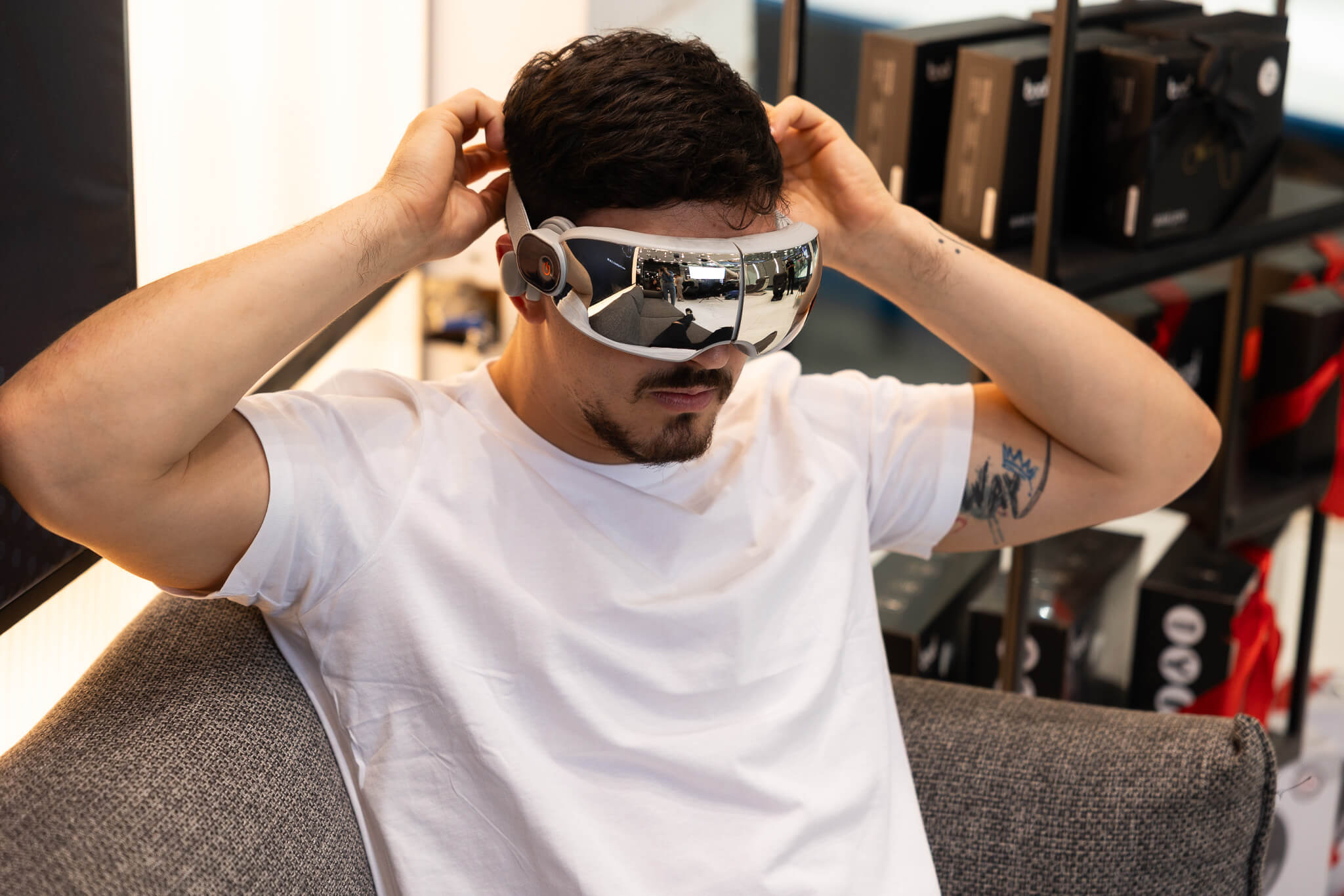 עיסוי לעיניים עם חימום, רטט, לחץ אוויר ורמקול בלוטוס. מסייע בשחרור מיגרנות, מתחים וסימני עייפות.